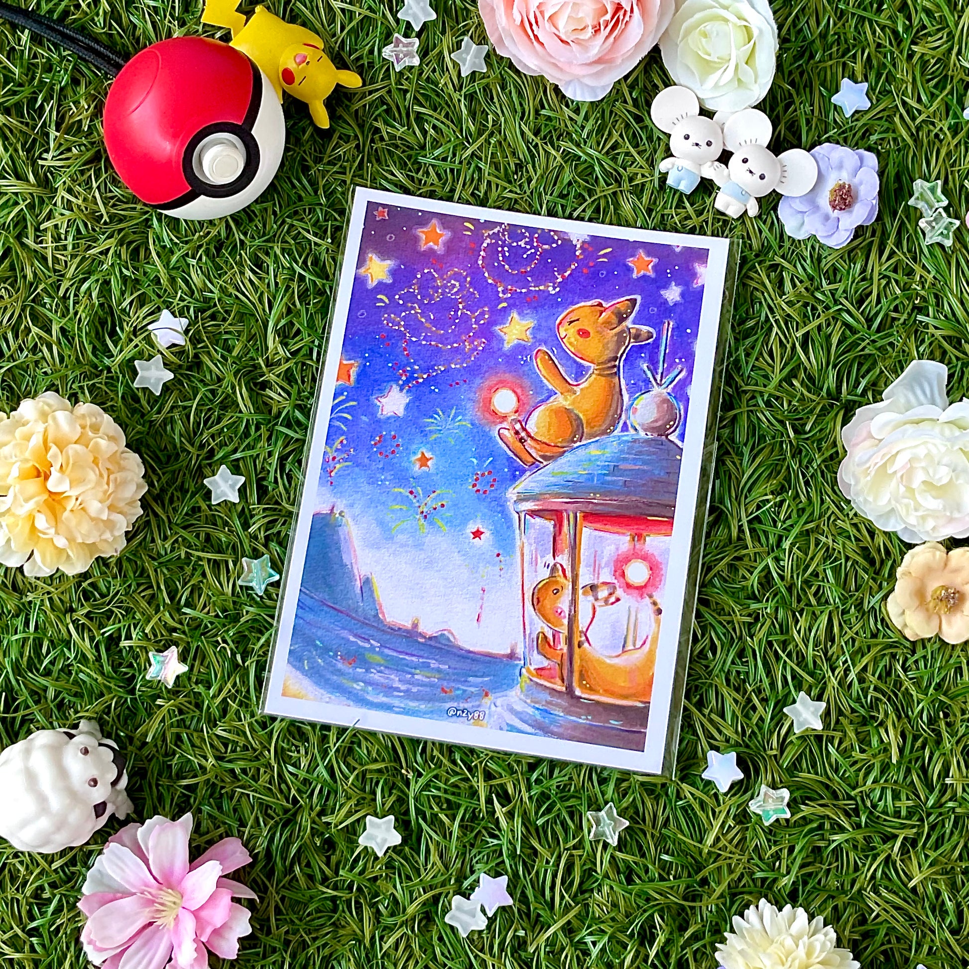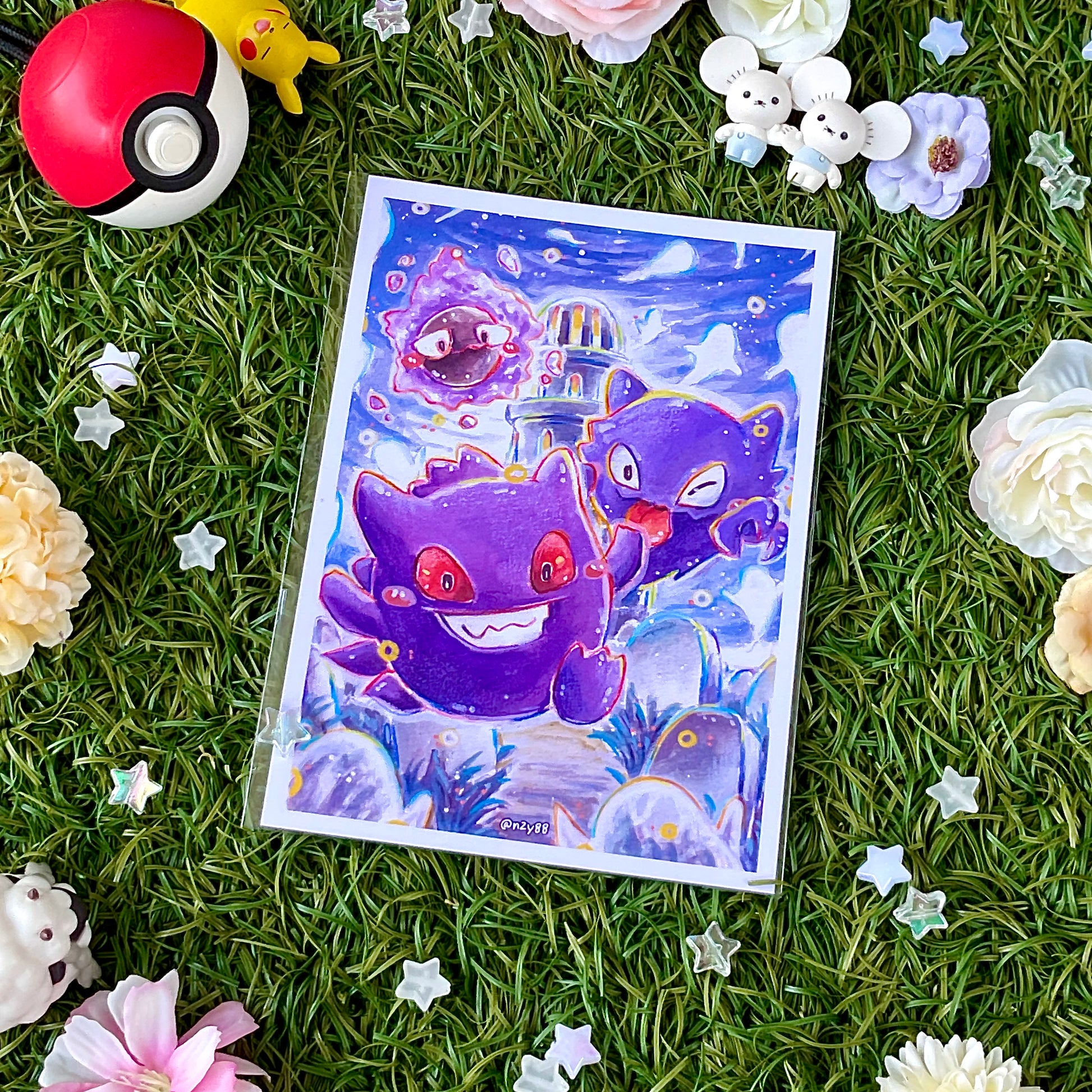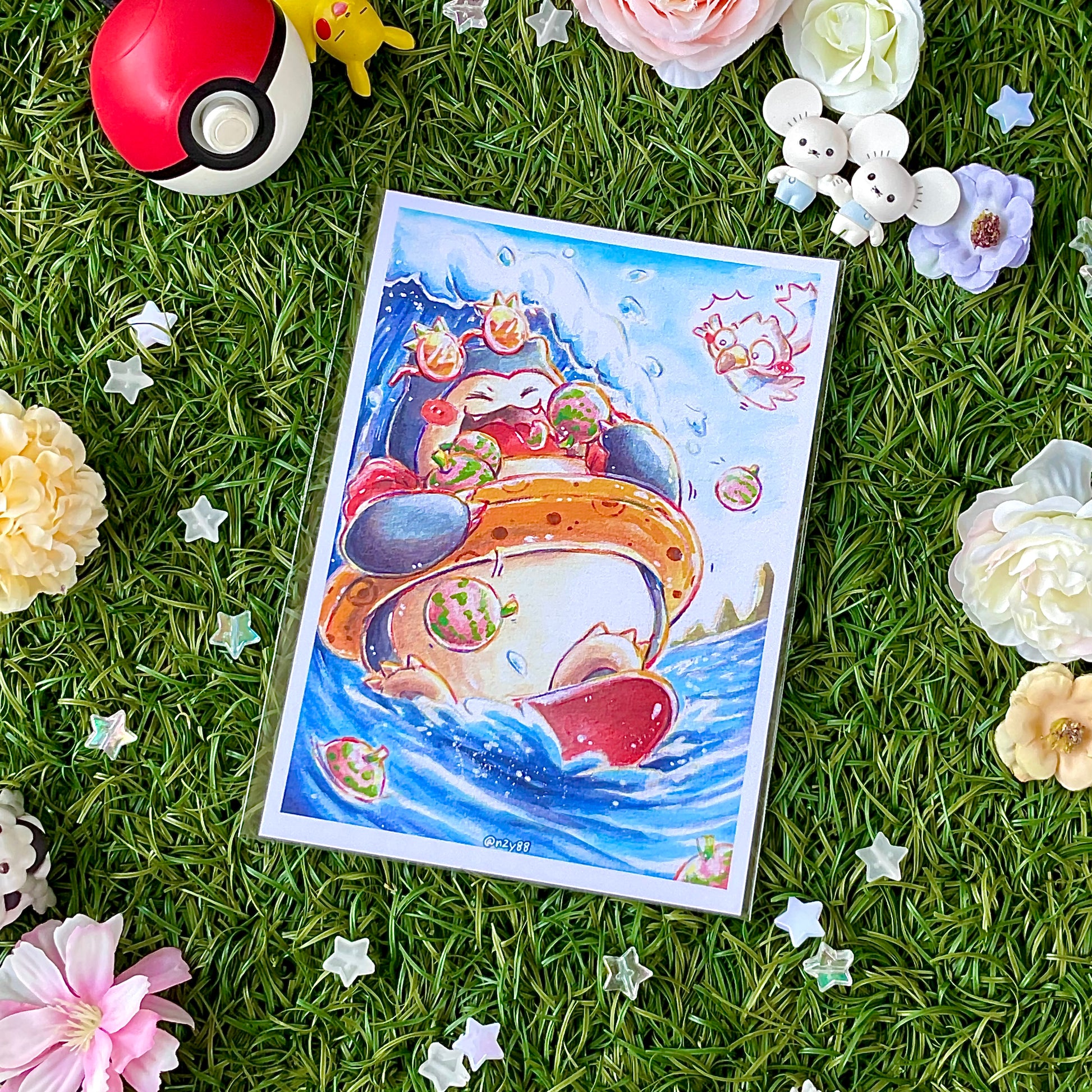 A6/Postcard sized sealed photo prints of my watercolor + acrylic marker paintings, featuring Pokemon! Each illustration was done on mix-media paper, scanned in and printed at home. Designs will be added along the way!