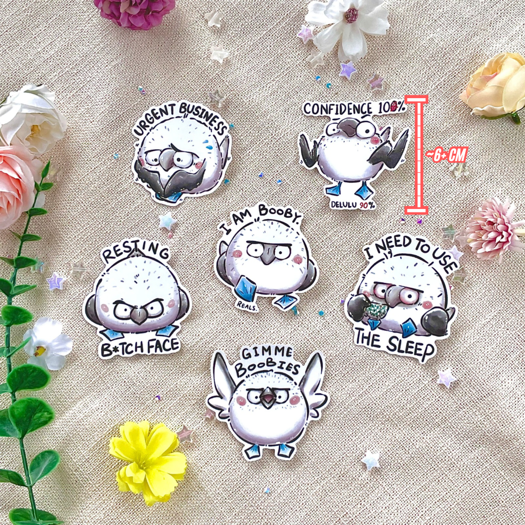 6cm+ tall, big stickers of the ... you haven't heard? Blue-footed BOOBY BIRDS (yes, they are real) are ready to join your sticker army! Wrap it around your tumbler or smack it your laptop: these stickers are very durable and even repositionable, leaving behind very little residue. Comes with a tough laminate to protect the sticker from scratches. Which sticker do you relate to? Or, just get all 6 designs for a discount!